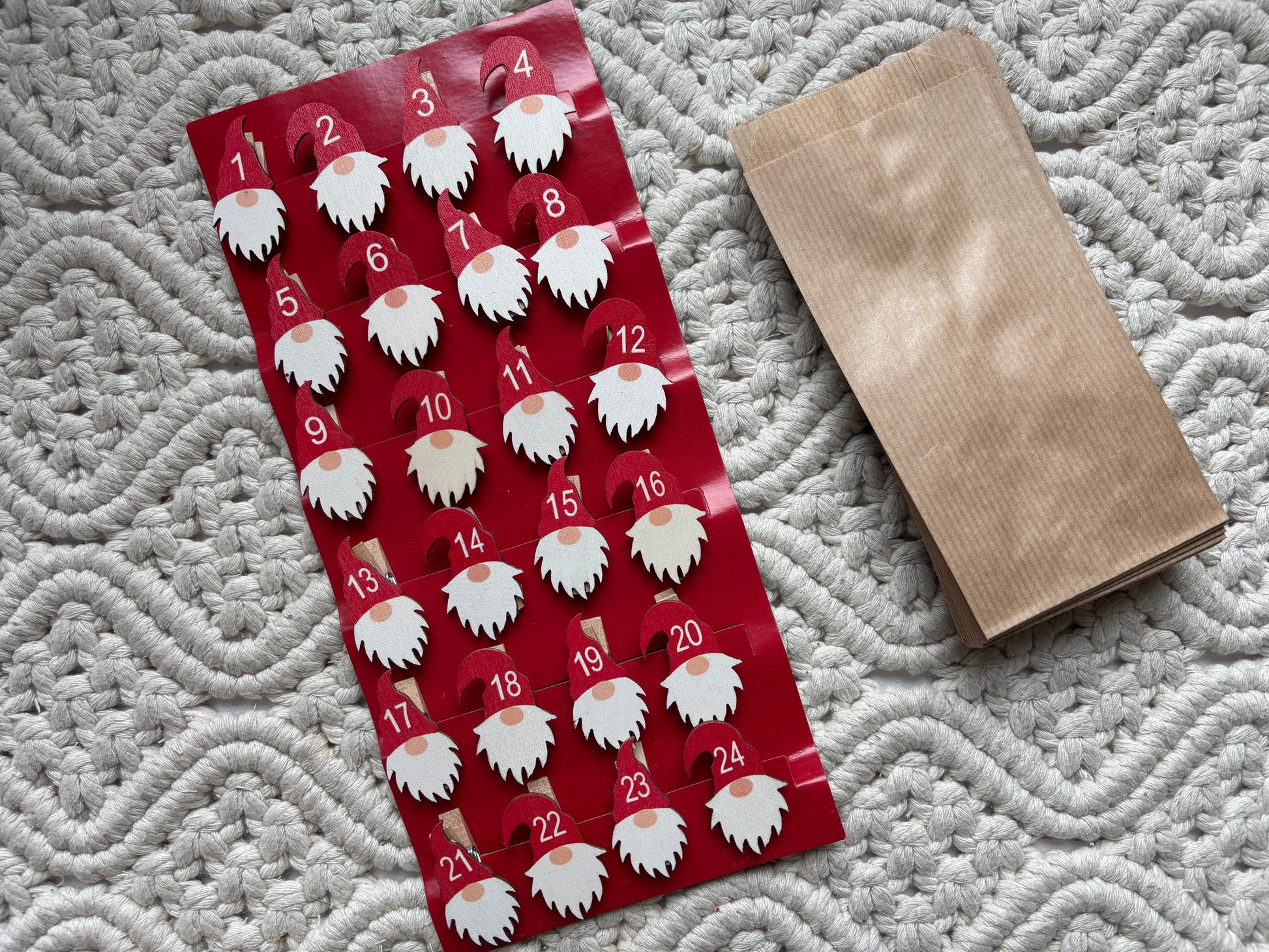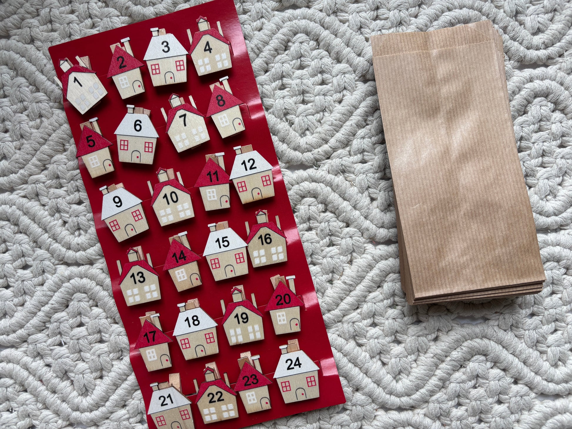 • 24 sacchettini di carta kraft da riempire con tutto ciò che desideri: dolcetti, biglietti, pensieri o piccole sorprese (NB: i sacchetti saranno vuoi e potrai scegliere tu come riempirli individualmente).